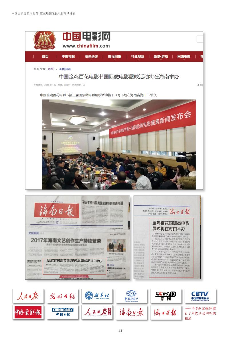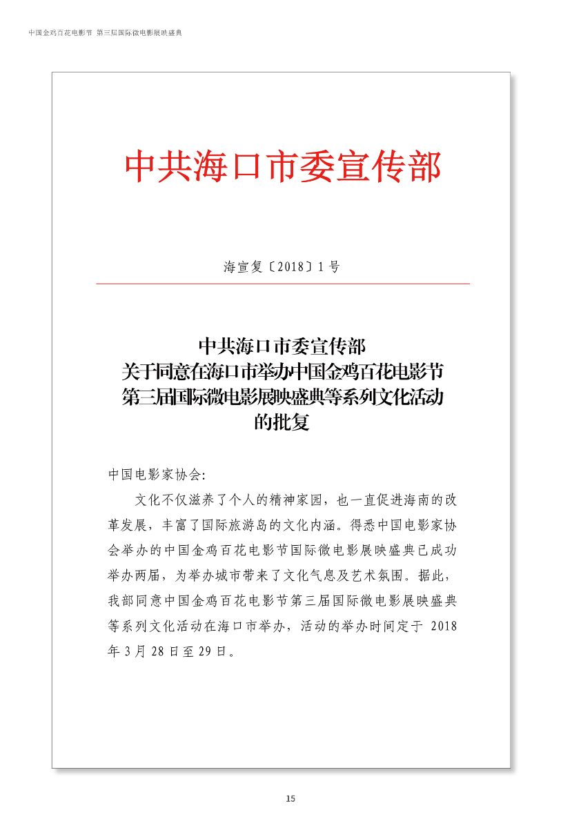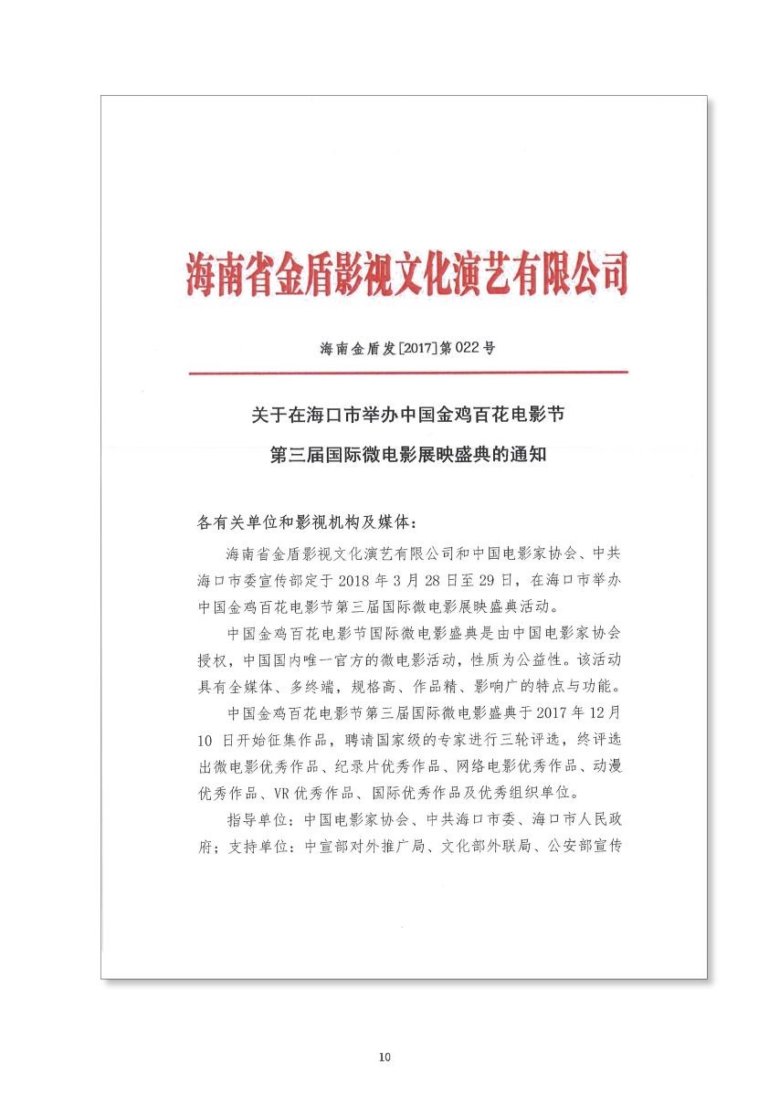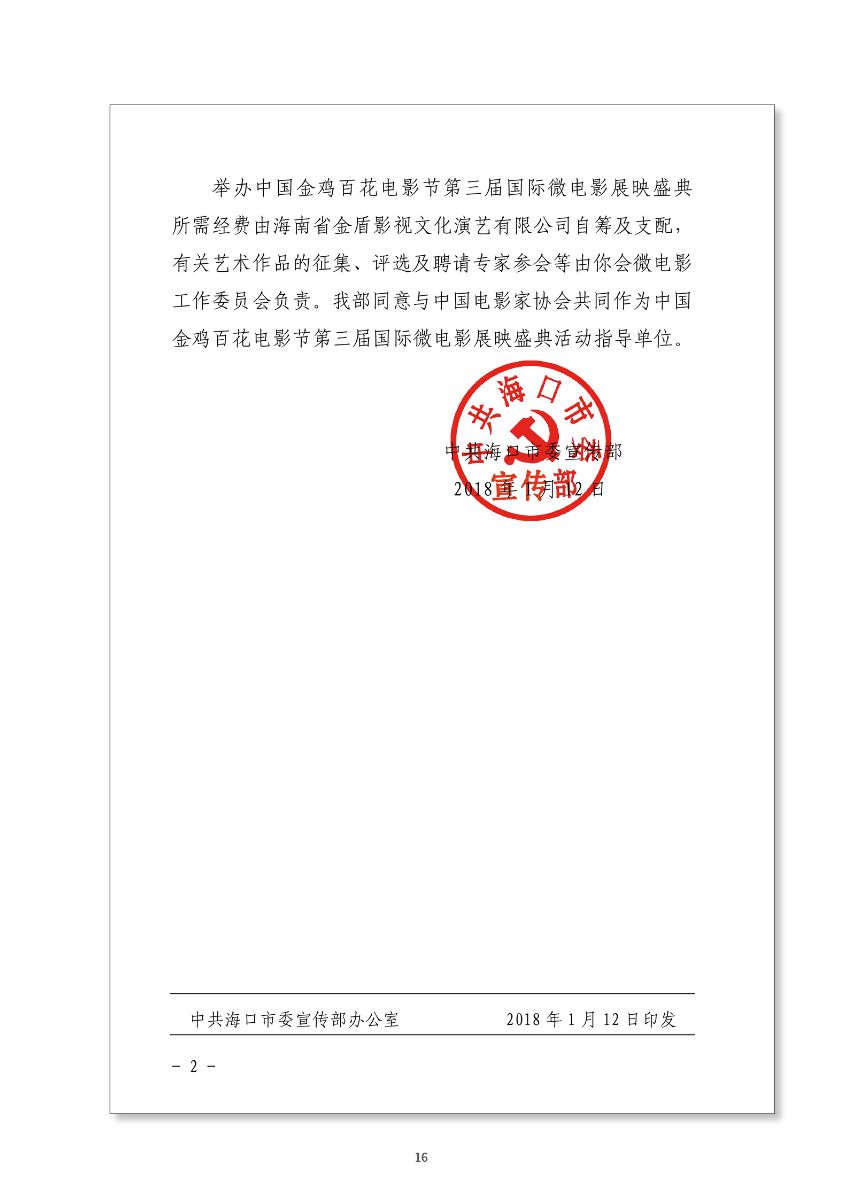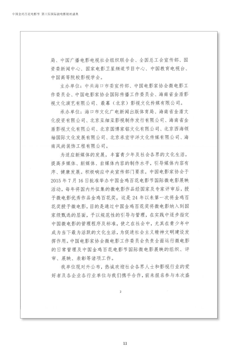 中國(guó)金雞百花電影節(jié)第三屆國(guó)際微電影盛典于2017年11月份開(kāi)始征集作品,目前作品征集活動(dòng)已經(jīng)接近尾聲。據(jù)初步統(tǒng)計(jì),共征集到各類作品7000余部,慶典活動(dòng)擬定于2018年3月28日-29日在海南省海口市舉辦。 中國(guó)金雞百花電影節(jié)國(guó)際微電影盛典是由中國(guó)電影家協(xié)會(huì)授權(quán),中國(guó)國(guó)內(nèi)唯一官方微電影展映活動(dòng),屬于公益性、學(xué)術(shù)性的展映,目前已成功舉辦兩屆,取得了良好的社會(huì)效益。該盛典還具有全媒體、多終端展映微電影作品的特色,對(duì)挖掘影視創(chuàng)作和制作人才,搭建平臺(tái)扶持微電影產(chǎn)業(yè)的發(fā)展,提高多媒體、新媒體、自媒體內(nèi)容的制作水平,豐富青少年及社會(huì)各界的文化生活,聚攏影視行業(yè)的新生力量,都具有廣泛而深遠(yuǎn)的意義。同時(shí),在海南建省30周年之際,中國(guó)金雞百花電影節(jié)國(guó)際微電影盛典也將為喜慶的30周年慶增加一縷絢麗的色彩。
