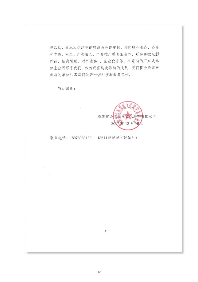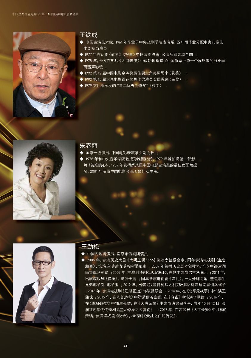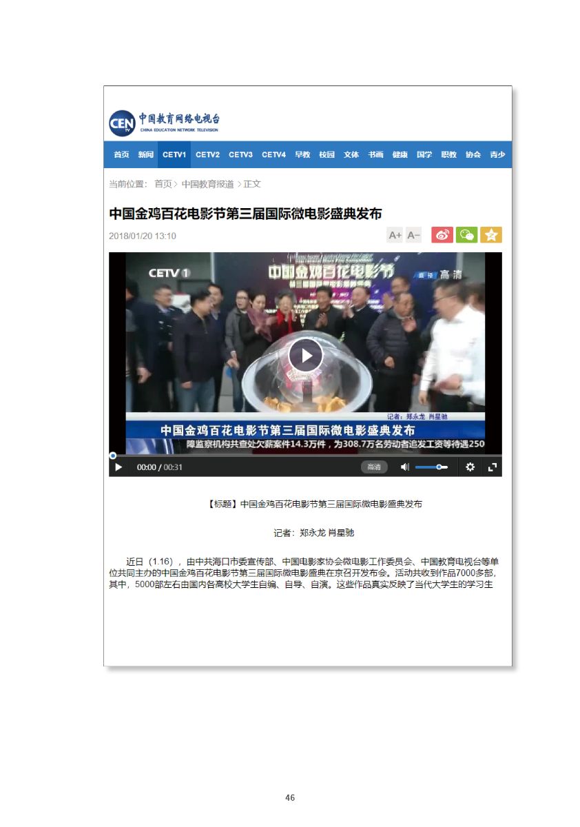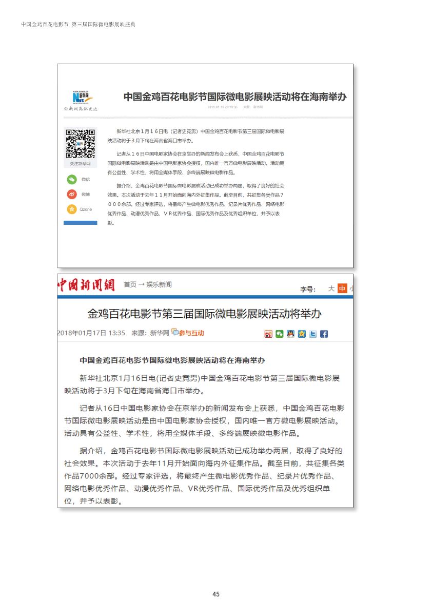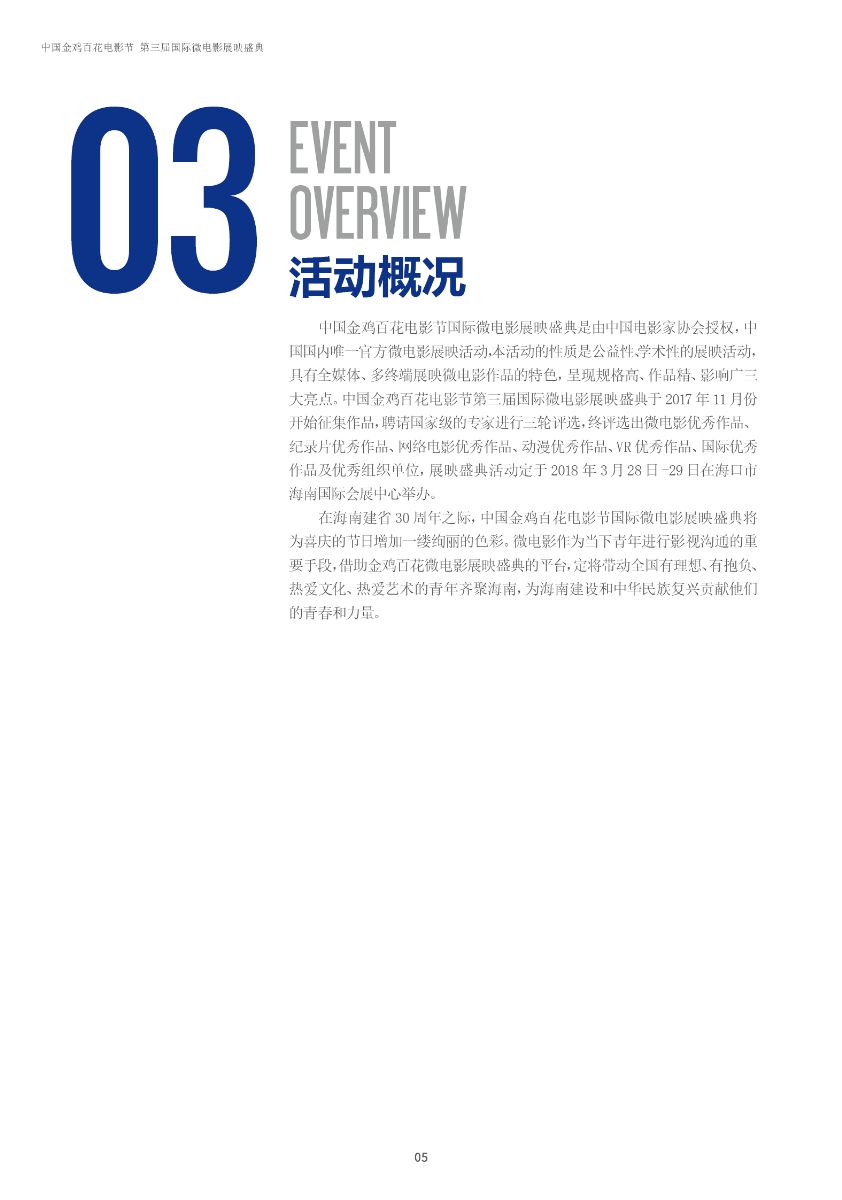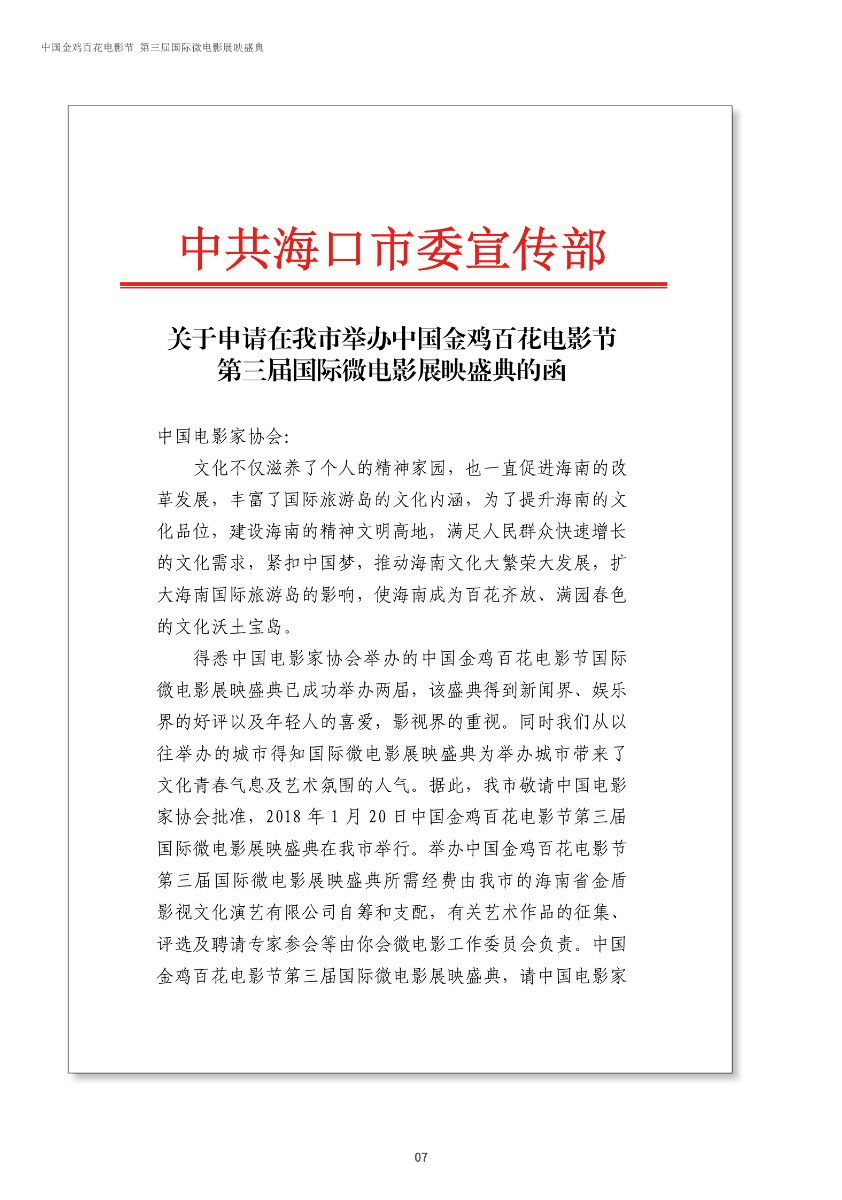 中國(guó)金雞百花電影節(jié)第三屆國(guó)際微電影盛典于2017年11月份開(kāi)始征集作品,目前作品征集活動(dòng)已經(jīng)接近尾聲。據(jù)初步統(tǒng)計(jì),共征集到各類作品7000余部,慶典活動(dòng)擬定于2018年3月28日-29日在海南省海口市舉辦。 中國(guó)金雞百花電影節(jié)國(guó)際微電影盛典是由中國(guó)電影家協(xié)會(huì)授權(quán),中國(guó)國(guó)內(nèi)唯一官方微電影展映活動(dòng),屬于公益性、學(xué)術(shù)性的展映,目前已成功舉辦兩屆,取得了良好的社會(huì)效益。該盛典還具有全媒體、多終端展映微電影作品的特色,對(duì)挖掘影視創(chuàng)作和制作人才,搭建平臺(tái)扶持微電影產(chǎn)業(yè)的發(fā)展,提高多媒體、新媒體、自媒體內(nèi)容的制作水平,豐富青少年及社會(huì)各界的文化生活,聚攏影視行業(yè)的新生力量,都具有廣泛而深遠(yuǎn)的意義。同時(shí),在海南建省30周年之際,中國(guó)金雞百花電影節(jié)國(guó)際微電影盛典也將為喜慶的30周年慶增加一縷絢麗的色彩。